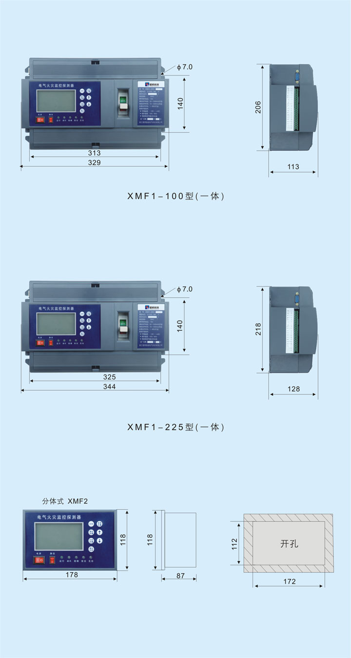 XMF1作為獨立式電氣火災(zāi)監(jiān)控探測器,為充分考慮安裝使用的便捷,方便連接進出線導(dǎo)線,而設(shè)計了活動安裝面板,在安裝進出導(dǎo)線時,面板可由上撥開,連接完畢扣上即可。注意:選用XMF1-100型時連接導(dǎo)線的接線端子最大寬度15mm,選用XMF1-225型時連接導(dǎo)線的接線端子最大寬度18mm。設(shè)備采用4只M6螺釘固定安裝。