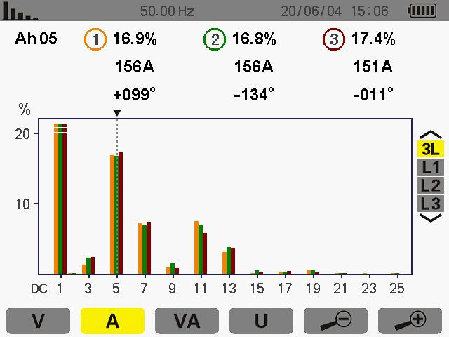 此次測量為5次諧波其ABC的THD值為 16.9% 16.8% 17.4%諧波電流為 156A 156A 151A。