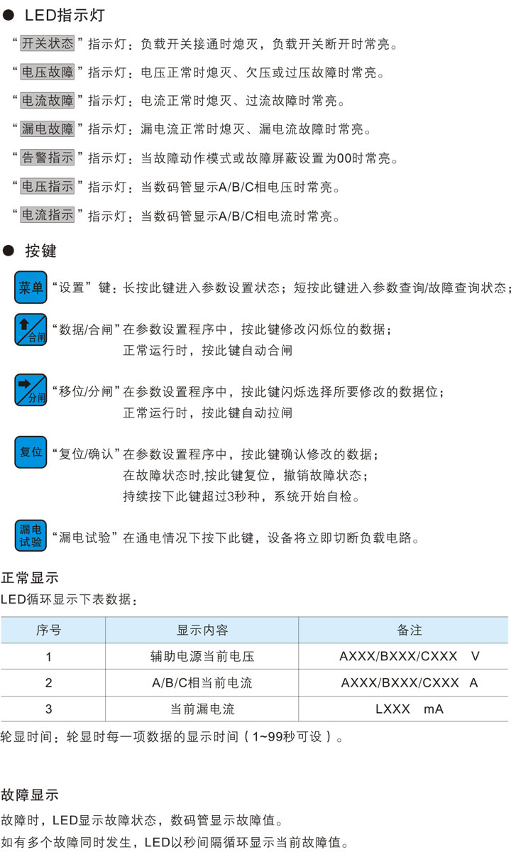 額定剩余動作電流整定值lΔn: 50~990mA可設(shè),級差為10mA,出廠默認(rèn)為500mA