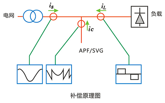 對(duì)SVG而言,額定輸出功率按照完全補(bǔ)償無(wú)功而計(jì)算,也可以全功率補(bǔ)償單相負(fù)載電流,保持電網(wǎng)側(cè)三相電流平衡,也可以最大用一半的功率補(bǔ)償13次以內(nèi)低次諧波,其余功率用于無(wú)功補(bǔ)償,總輸出功率: