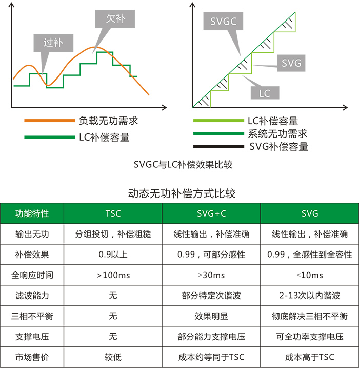 傳統(tǒng)無功補償采用的是慢速開關(guān)器件對電容器分組投切的方式,存在級差,補償精度差,響應速度慢。SVG采用的是由高速開關(guān)器件產(chǎn)生補償電流的方式,不存在補償精度的問題,而且響